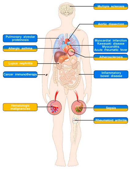 The immune system is regarded as a major player in the development and progression of cardiovascular diseases [91,92,93,94,95,96,97], including atherosclerosis, myocardial infarction (MI), dilated cardiomyopathies, myocarditis, hypertension, Kawasaki disease (KD), aortic dissection and acute rheumatic fever. In some of these conditions, a prominent role for GM-CSF and/or IL-3 has also been shown. Several lines of evidence support the notion that GM-CSF exerts a pro-atherogenic role. Ldlr−/− Csf2−/− mice develop smaller lesions [98], whereas exogenous administration of GM-CSF to atherosclerotic mice stimulates intimal cell proliferation and promotes the development of atherosclerosis plaques [99,100]. Interestingly, IRA B cells expand in atherosclerosis and play a pathogenetic role by producing GM-CSF that promotes DC generation and differentiation of IFNγ-secreting Th1 cells [42]. GM-CSF and IL-3 also promote extramedullary hematopoiesis and differentiation of monocytes that infiltrate and aggravate atherosclerotic lesions [101].