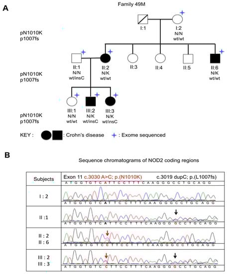 (A) Pedigree of family F49M with segregation of the c.3030A>C; p.(N1010K) and c.3019dupC; p.(L1007fs) variations. (B) Chromatograms for NOD2 coding region in exon 11. The red arrows show the c.3030A>C nucleotide substitution consisting of the amino acid substitution N1010K. The black arrows show the c.3019dupC frameshift variation (rs2066847).
