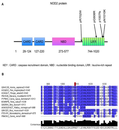 (A) Location of the p.R702W (rs2066844), p.G908R (rs2066845), p.L1007fs (rs2066847) and p.N1010K NOD2 protein-altering variations. (B) Multiple alignments for the amino acid sequence of the NOD2 proteins in 11 species in agreement with a conserved amino acid.