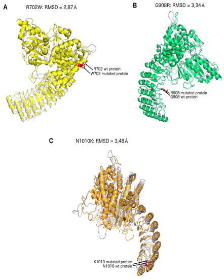(A) Structural predictions of the human native NOD2 protein (amino-acids 219–1040) and the human R702W mutated NOD2 proteins (amino-acids 219–1040); (B) structural predictions of the human native NOD2 protein (amino-acids 219–1040) and the human G908R mutated NOD2 proteins (amino-acids 219–1040); (C) structural predictions of the human native NOD2 protein (amino-acids 219–1040) and the human N1010K mutated NOD2 proteins (amino-acids 219–1040).