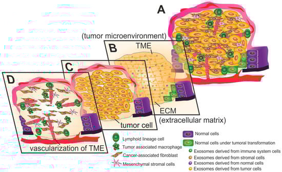 As emphasized throughout the last sections, the communication between cells within the TME, be it paracrine (between cells of different types located in the same anatomical region), autocrine (between cells of the same type) or even endocrine (between cells of different types located in different anatomical regions), is critical to modulate the cellular/molecular events involved in maturation of the TME. Resident cells within the TME communicate with each other mainly based on cytokines, chemokines and growth factors. Frequently, the expression of cytokines by tumor cells is accompanied by expression of the respective receptors [105]. However, the communications within the TME are also mediated by vesicles secreted by cells, circumventing the need for cytokines specific receptors.