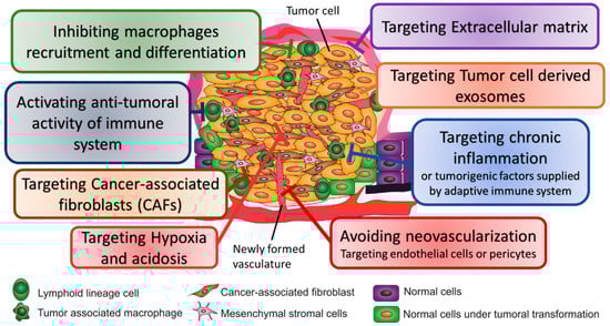 Understanding the major events occurring in the TME that support primary tumor growth and how these events impact the modulation of the environment is of utmost relevance to assist the definition of efficient therapy strategies [22]. Figure 2 highlights current strategies used to target TME components.