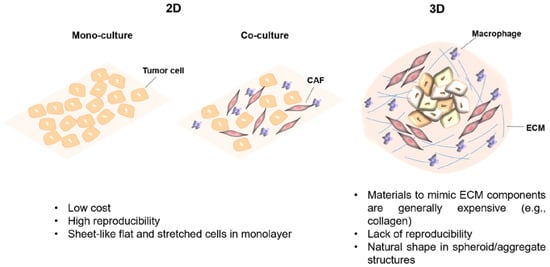 Main properties of in vitro 2D and 3D culture systems [187,188]. CAF, Cancer-associated fibroblast; ECM, Extracellular matrix.