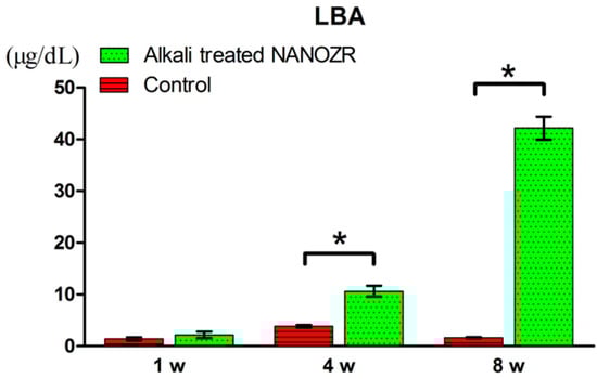 - Nishizaki, M.; Komasa, S.; Taguchi, Y.; Nishizaki, H.; Okazaki, J. Bioactivity of NANOZR Induced by Alkali Treatment. Int. J. Mol. Sci. 2017, 18, 780. [Google Scholar] [CrossRef] [PubMed]