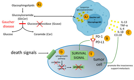 Gaucher disease—an inherited metabolic disorder caused by mutations in the gene GBA1, encoding acid-β-glucosidase (GlcCerase; Gcase)–A1. It leads to accumulation glucocerebroside in macrophages–A2. Gaucher Cells resemble alternatively activated macrophages (M2). Alternatively activated macrophages/Gaucher cells, play a pro-tumoral role in tumor microenvironment. PD-1 expression on macrophage cells affects cancer cell survival by binding to PD-L1 on the tumor cell–B. Production of broad spectrum of cytokines promote the invasiveness of cancer cells and support angiogenesis and their ability to create metastasis–C. Due to enzymatic block of ceramide formation, cell death signals transmitted to the cancer cell are not read–D. As the result of current disorders in the cancer cell, survival signals over ventricular death signals prevail–E.