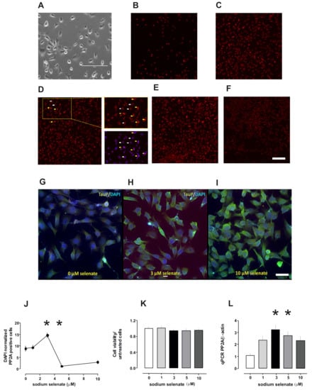 Neuroblastoma SHSY-5Y cells (ATCC CRL-2266, a kind gift from Dr. El-Agnaf, QBRI) were prepared and differentiated as described by Encinas et al. [,]. In brief, cells were plated 10,000 cells/2 mL of media (Dulbecco’s modified Eagle’s medium (DMEM) containing heat-inactivated bovine fetal serum 12% (F12), 5 mL glutamax and penicillin (20 units/mL), streptomycin (20 mg/mL). All trans-retinoic acid (RA) was added to the media at a final concentration of 10 µM (50% ethanol v/v) all material from Thermo Fisher Scientific, (Waltham, MA, USA). Cells were maintained at 37 °C in a saturated humid atmosphere containing 95% air and 5% CO2. After 5 days in the presence of RA, cells were washed three times with DMEM and incubated 24 h with sodium selenate (Sigma-Aldrich, St. Louis, MO, USA), dissolved in media to the required concentration (0, 1, 3, 5 and 10 µM).