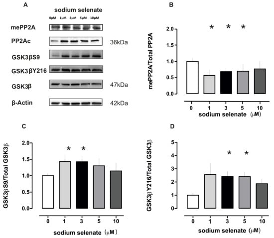 Sodium selenate treatment reduces active PP2Ac (mePP2A) and results in an increase in GSK3β phosphorylation at both inhibitory S9 and catalytic Y216 sites. (A) Immunoblot images of mePP2A, PP2Ac, (both 36 kDa) total GSK3β, GSK3βS9, GSK3βY216 (all 47 kDa) and loading control β-actin (42 kDa) for the different selenate dose. (B) Histogram plot of mePP2A-levels normalized to PP2Ac and β-actin values for different selenate doses. (C) Histogram plot of GSK3βS9/total GSK3β after different selenate doses. (D) Histogram plot of GSK3βY216/ total GSK3β after different selenate doses (in all plots asterisk p < 0.05).