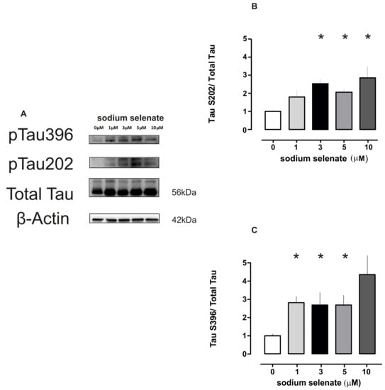 Sodium selenate treatment enhances total Tau and phosphorylation of two disease marker epitopes AT8 and PHF1 in a dose responsive manner. (A) Immunoblot images of Total Tau (56 kDa) and phosphorylated S202 (pTau202) and S396 (pTau396) epitopes for the different sodium selenate doses, loading control β-actin as above (not shown). (B,C) Histogram plots of pTauS202 and pTau396 after different selenate doses (asterisk p < 0.05).