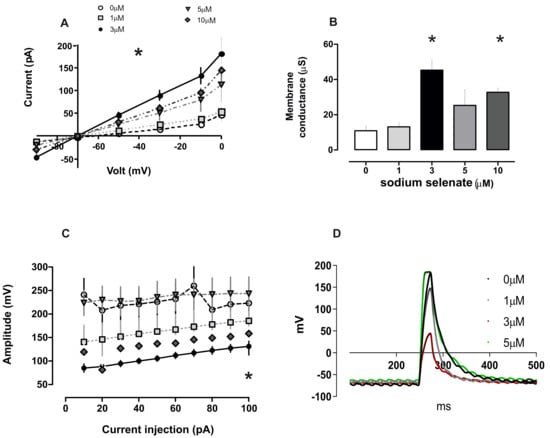 Sodium selenate alters membrane potential and conductance in a dose dependent manner. (A) Current-voltage (I-V) relationship for the effects of selenate dose on retinoic acid (RA) differentiated SHSY-5Y cells. (B) Bar-chart of membrane conductance after different selenate dose. (C) Membrane potentials after current injection in SHSY-5Y cells–indicative that 3 µM sodium selenate significantly dampens cell excitability (labelling as in A). In all sub-figures, asterisk p < 0.05. (D) Action potential (AP) changes induced with 90 pA current injection in RA differentiated SHSY-5Y cells after treatment with different selenate concentrations. Note that 3 µM sodium selenate has the maximum effect on AP.