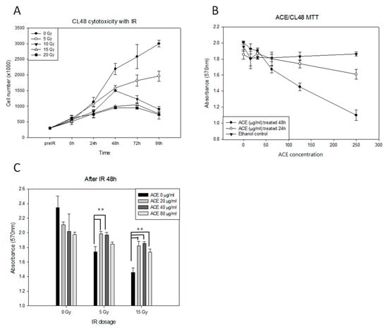 The protective effects of Antrodia cinnamomea extract (ACE) against irradiation in human normal liver CL48 cells. (A) Cytotoxicity of irradiation in CL48. Cells were treated with different dosages (0, 5, 10, 15, and 20 Gy) of irradiation and counted by hemocytometer at intervals as indicated. (B) Determination of the optimal ACE dosages. Cells were treated with different concentrations of ACE for 24 h or 48 h, followed by 3-(4,5-dimethylthiazol-2-yl)-2,5-diphenyltetrazolium bromide (MTT) assay for cell survival. For the control group, the same concentrations of ethanol were used for each ACE treatment experiment. (C) The protective effect of ACE against irradiation. Cells were pre-treated with different concentrations of ACE for 16 h followed by various dosages of irradiation; they were evaluated by MTT assay 48 h later. Cell survival was evaluated by MTT assay. Results were obtained from three independent experiments; each experiment was done in triplicate. **, p < 0.01, as compared with the control group.