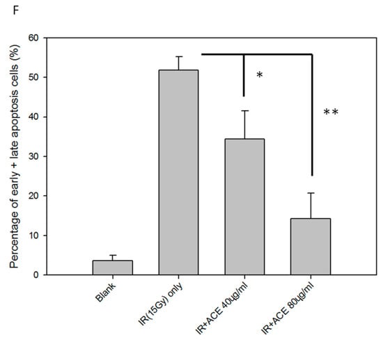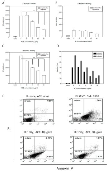 We examined the protective effects of ACE on irradiation-induced apoptosis of CL48 liver cells. The irradiation-induced caspase-3, -8, and -9 activities (Figure 2A–C) were attenuated by ACE treatment in a dose-dependent manner (Figure 2D). Irradiation-induced apoptosis, as examined by Annexin V and Propidium Iodide (PI) double staining followed by flow cytometry assay (Figure 2E). Percentages of the early and late apoptotic cells were combined and compared statistically. As shown, apoptosis was significantly inhibited by pre-treatment with ACE in a dose-dependent manner and decreased from 52% to 34% and 14% by ACE 40 μg/mL and 80 μg/mL, respectively (Figure 2F).