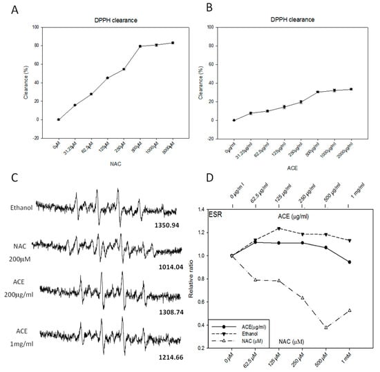Examination of direct free radical-scavenging activities of ACE. DPPH free radical-scavenging activity of N-acetyl-l-cysteine (NAC) (A) and ACE (B) were analyzed. Results were obtained from three independent experiments, each experiment was done in triplicate. The ESR spectra of 5,5-dimethyl-1-pyrroline-N-oxide (DMPO) in phosphate buffered saline (PBS) were measured in the presence or absence of ACE or (N-acetyl-l-cysteine) (NAC) (200 μM) (C) and plotted and compared in a dose-dependent manner (D).