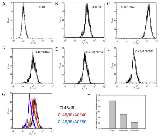 Reactive oxygen species (ROS) scavenging activity of ACE in CL48 cells. After being treated and harvested as described in the Materials and Methods section, cells were analyzed by flowcytometry after incubation with 2′,7′-dichlorofluorescin diacetate (DCFH-DA) for 15 min. (A) Control cells without treatment, (B) IR treated only, (C) H2O2 treated only, (D) pre-treated with NAC before IR, (E) pre-treated with ACE 40 μg/mL before IR, (F) pre-treated with ACE 80 μg/mL before IR. (G) Histograms of B, E, and F were combined to show the dose-dependent ROS scavenging activity of ACE. (H) Fold change of control fluorescence intensity by 40 μg/mL and 80 μg/mL of ACE, respectively.