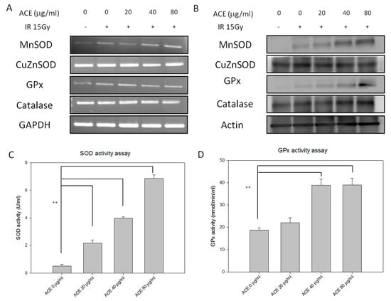 Expression and activity levels of several important redox enzymes were evaluated in liver cells with or without ACE treatment. As a result, ACE was found to enhance the irradiation-induced expression of MnSOD and GPx in a dose-dependent manner both at the mRNA (Figure 5A) and protein (Figure 5B) and activity (Figure 5C,D) levels.