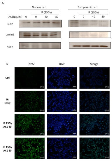 Expression of the upstream regulator of MnSOD and glutathione peroxidase (GPx), i.e., the redox-sensitive transcription factor Nrf2 (Nuclear factor-erythroid 2-related factor), in the nucleus vs. cytoplasm was examined by Western blot and immunofluorescence staining. As a result, it is evident that irradiation could induce nuclear translocation of Nrf2 and ACE may further increase its nuclear expression in a dose-dependent manner (Figure 6A). The results were also demonstrated by immunofluorescence staining for Nrf2 in CL48 cells irradiated with or without ACE. While irradiation alone could increase both nuclear and cytoplasmic expression of Nrf2 (Figure 6B, second panel), pre-treatment with ACE dramatically further enhanced this effect in a dose-dependent manner (Figure 6B, third and fourth panels). The Figure 6B quantity ratio of nucleus Nrf2 is expressed in Figure 6C.