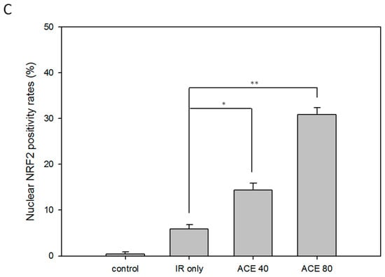 Enhancement of the irradiation-induced nuclear factor erythroid-2-related factor (Nrf2) expression and nuclear translocation by ACE treatment. With or without ACE pre-treatment for 16 h, CL48 cells were irradiated with a dose of 15 Gy and harvested 24 h later for Western blot (A) and immunofluorescence staining (B, left) of Nrf2. The slides were counterstained with 4′,6-diamidino-2-phenylindole (DAPI) (300 nM in PBS) (B, middle) and merged images (B, right). (C) The nuclear Nrf2 positivity rates were plotted. Results were obtained from random fields of three independent experiments for each group. *, p < 0.05; **, p < 0.01, as compared with the IR only group.