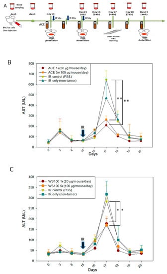 Surgical resection and liver transplantation are the primary treatment modalities for hepatocellular carcinoma (HCC). Various radiotherapy modalities are suitable for treating unresectable HCC and could be used as a post-surgery adjuvant therapy or in concomitant radio/chemotherapy. Radiation-induced liver disease (RILD) is one of the major limits of HCC radiotherapy and may compromise patients’ life quality and, due to various clinical conditions, only 30% to 40% of patients may benefit from radiotherapy []. Along with the development of three-dimensional conformal radiotherapy, image-guided high-dose radiation treatment could be delivered to focal liver tumor areas. Several studies have demonstrated that stereotactic body radiotherapy (SBRT) with 24 to 60 Gy administered in three to six fractions irradiated from different directions led one-year overall survival rates to rise 48% to 82% [,]. Since the tumor receives a much higher dose than adjacent non-tumor tissues, RILD is significantly reduced in SBRT. However, RILD still result in a general decline in liver function and markedly elevated transaminases and/or jaundice due to accumulating radiotoxicity in surrounding non-tumor tissues, either in an acute response within a few days or as a late response months to years after radiotherapy []. According to current radiotherapy administered in the form of SBRT, we believe that, with optimal doses of ACE, RILD can be significantly reduced without compromising the efficacy of HCC radiotherapy. In our current tumor-bearing mouse model study, neither the radiation doses nor the ACE doses used affected tumor growth in 25 days of our experimental period.