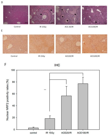 AC has been demonstrated to be capable of alleviating liver inflammation in various animal models [,,]. First, we re-confirmed the hepato-protective effect of ACE in CCl4-induced acute hepatitis mice (Supplementary Figure S2). Here, we further demonstrate the hepato-protective effect of ACE in the irradiation-induced hepatitis mouse model. In the scheme of the animal model experiment, mice were divided into four groups, and each group had six mice (Figure 7A). As a result, both ACE doses were found to reduce the hepatitis markers Aspartate aminotransferase (AST) (Figure 7B) and Alanine aminotransferase (ALT) (Figure 7C). The hepato-protective effect of ACE on irradiation-induced hepatitis was also demonstrated histologically by haematoxylin and eosin (H&E) staining in decreasing hepatitis area of the liver samples sections (Figure 7D). As demonstrated by immunohistochemical staining, the expression and nuclear translocation of Nrf2 were also significantly enhanced and nuclear localized in the mice of ACE treatment groups (Figure 7E). The Figure 7E quantity ratio of nucleus Nrf2 is expressed in Figure 7F.