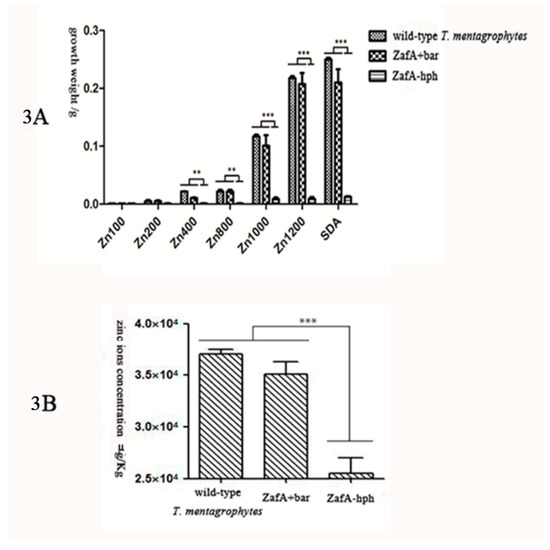 (A): The growth weight of wild-type T. mentagrophytes strain, ZafA-hph, and ZafA+bar. In Sabouraud glucose liquid medium, there was no significant growth weight difference in ZafA+bar and the wild-type T. mentagrophytes strain. However, the difference between ZafA-hph and the wild-type T. mentagrophytes strain was significant in growth weight. ** p < 0.05; *** p < 0.01. (B): The zinc absorption capacity of wild-type T. mentagrophytes strain, ZafA-hph, and ZafA+bar. The zinc ions concentration of the wild-type T. mentagrophytes strain, ZafA-hph, and ZafA+bar were determined by inductively coupled plasma-mass spectrometry (ICP-MS). Relative to the wild-type T. mentagrophytes strain and ZafA+bar, the zinc ions concentration was significantly lower in the ZafA-hph. ** p < 0.05; *** p < 0.01.