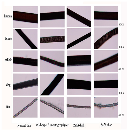 In vitro biodegradation of hair. The hair biodegradation test examined the susceptibility of different animal hair to the test strains of T. mentagrophytes. No obvious traces of pathological changes or decomposition were found in human and dog hair. The fox and feline hair were highly susceptible to T. mentagrophytes, and the rabbit hair was slightly susceptible to T. mentagrophytes. The decomposition significantly reduced on fox and cat’s hair in ZafA-hph, the pathological changes or decomposition on fox and cat’s hair have no obvious difference in ZafA+bar and the wild-type T. mentagrophytes strain.