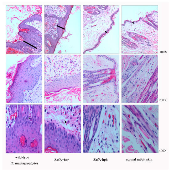 Animal skin inoculation test. Histopathological analysis of sections of skin infected with three strains. Sections were stained with hematoxylin–eosin (HE). Compared to normal rabbit skin, there were different degrees of thickening of the stratum corneum and the stratum spinosum layers (as shown by the black line), with an initial infiltration of inflammatory cells (as shown by the black arrow) following the inoculation of the wild-type T. mentagrophytes strain and ZafA+bar. However, the rabbit skin had a very slight lesion following inoculation with ZafA-hph, while there was no obvious difference with the normal skin.