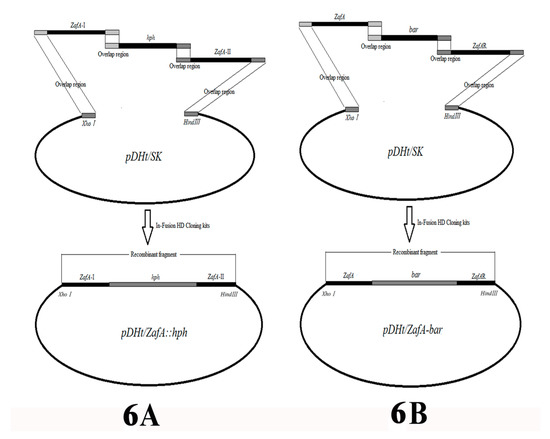 Construction of the transformation vectors. (A): The hph gene of pAN7–1 and two flanking sequences of the ZafA gene were inserted simultaneously into plasmid pDHt/SK and digested by XhoI/HindIII by means of In-Fusion HD Cloning kits. The forward primer of ZafA-I has a 20-nt overlap region with the pDHt/SK digested by XhoI, and the reverse primer of ZafA-I has a 15-nt overlap region with the hph. The forward primer of hph has a 15-nt overlap region with the ZafA-I and the reverse primer of hph has a 15-nt overlap region with ZafA-II. The forward primer of ZafA-II has a 15-nt overlap region with the hph and the reverse primer of ZafA-II has a 20-nt overlap region with pDHt/SK digested by HindIII. (B): The bar gene of pBARGPE1-mCherry, right flanking sequences of the ZafA gene, and whole ZafA gene were inserted simultaneously into plasmid pDHt/SK and digested by XhoI/HindIII by means of In-Fusion HD Cloning kits. The forward primer of ZafA has a 20-nt overlap region with the pDHt/SK digested by XhoI and the reverse primer of ZafA has a 15-nt overlap region with the bar. The forward primer of bar has a 15-nt overlap region with the ZafA, and the reverse primer of bar has a 15-nt overlap region with ZafAR. The forward primer of ZafAR has a 15-nt overlap region with the bar and the reverse primer of ZafAR has a 20-nt overlap region with pDHt/SK digested by HindIII.
