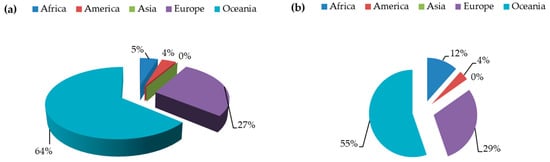 Lupin production and cultivated area worldwide for 2017 is estimated at about 1,610,969 tonnes and 930,717 ha respectively [27]. Oceania is the largest producer, with 64% and 55% of the global production and cultivated area, respectively (Figure 1), while Europe is second. L. angustifolius is the main cultivated species in Australia [26] and northern Europe, while L. albus is the dominant one in southern Europe [24]. The percentage of global production attributed to Europe increased remarkably from 17.6% in 2013 [28] to 29% in 2017 (Figure 1). However, the cultivation of lupins in Europe is still limited because of the low number of target breeding programs, which is a crucial factor for low production and low expansion of lupin cultivation in Europe, as it has exploited little of the gene pool [29]. Identification of germplasm with tolerance to a range of abiotic stresses (calcareous soils, drought, occasional frost, etc.) is expected to expand lupin cultivation into a wider range of agro-climatic conditions across Europe, and it may increase grain or biomass production. Another key issue is the development of adaptive Bradyrhizobium strains that promote nodulation under various stresses and result in better plant growth and yield performance [30]. Furthermore, low productivity due to seasonal variability [31], low price of lupin grain [1] and EU policies that favored the importation of soya bean contributed to the decline of lupin production in Europe, especially during the second half of the 20th century [28,32]. Pulse cultivation occupied only 2.1% of the arable land in Europe in 2016, and lupins were grown on 11.9% of this area [33]. According to Lucas et al. [28], lupins could be a primal cultivation in different agro-climatic zones and marginal lands in Europe.