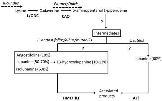 Breeding efforts that begun in 1928/29 in Germany led to the selection of the first low-alkaloid cultivars of L. angustifolius [81], and to identification of the genes that cause high alkaloid content in seeds. Quinolizidine alkaloids (QA) in lupins are toxic, bitter secondary metabolites, synthesized in aerial tissues and transported via the phloem to seeds. These compounds provide insect resistance, and total alkaloid content varies from 0.02 to 12.73% of the seed dry weight [142]. QA biosynthesis begins by the decarboxylation of lysine to produce cadaverine, which is further modified by various reactions (Figure 2).