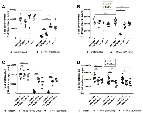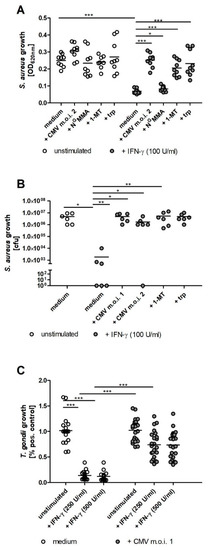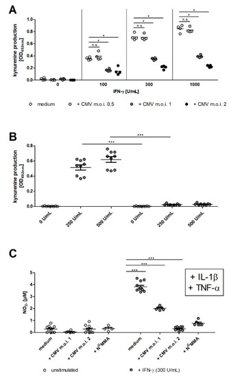 - Heseler, K.; Schmidt, S.K.; Spekker, K.; Sinzger, C.; Sorg, R.V.; Quambusch, M.; Zimmermann, A.; Meisel, R.; Däubener, W. Cytomegalovirus impairs the induction of indoleamine 2,3-dioxygenase mediated antimicrobial and immunoregulatory effects in human fibroblasts. PLoS ONE 2013, 8, e64442. [Google Scholar] [CrossRef] [PubMed]