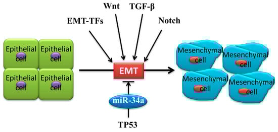 Most tumor cells achieve metastatic and invasive ability through EMT, resulting in a poor prognosis and even death [30]. As a cellular biological process, epithelial cells lose their morphologies and adhesive abilities and gain a mesenchymal phenotype, such as increased motilities (Figure 1) [31,32]. Thus, EMT is characterized by a loss of cell polarity and a decrease in expression of some epithelial markers, such as E-cadherin, cytokeratins, and α-catenin, as well as an increase in expression of some mesenchymal markers, such as N-cadherin, vimentin, fibronectin, and matrix metalloproteinases (MMPs) [24,30,31,33]. An increasing number of findings has documented the negative effect of miR-34a in tumor cell proliferation, metastasis, and invasiveness, indicating the important relationship between miR-34a and tumor-associated EMT [34,35].