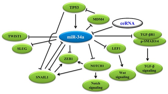 Taken together, these studies clearly indicate that ceRNA plays a vital role in cancer progression and/or EMT through gene expression regulation by sponging miR-34a.