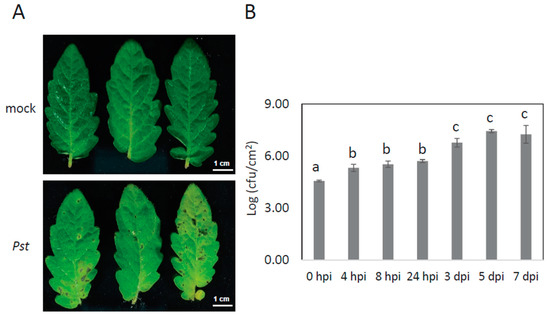Disease phenotypes and population dynamics of Pst DC3000 on tomato leaves. (A) Visible disease symptoms in tomato leaves after leaves were dipped into bacterial suspension at an OD600 of 0.02. Photos were taken at 5 days post-inoculation. (B) Bacteria titres in leaves at 0, 4, 8, 24 h or 3, 5, 7 days after inoculation with Pst DC3000. Error bars represent the standard deviation of three biological replicates. A statistical significance difference is shown between different time points using analysis of variance (ANOVA) with post-hoc Tukey’s honestly significant difference (HSD) test by labelling bars with different lowercase letter (a, b, and c).