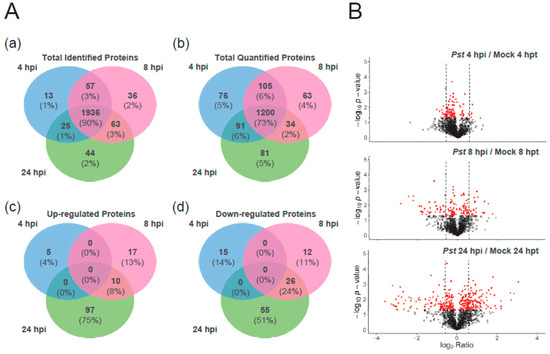 Proteomic change in tomato leaf between time points of Pst DC3000 inoculation 4, 8 or 24 hpi compared to each mock: 4, 8 or 24 hpt, respectively. (A) Venn diagrams showing unique and shared proteins between 3 time points which are (a) identified across replicates and (b) quantified in all 3 biological replicates or with significant increase, with fold change (c) greater than 1.5 or (d) less than 0.67 in quantity (p < 0.05), due to inoculation. (B) Volcano plots showing protein abundance ratio of Pst DC3000-inoculated over mock group at 4 hpi, 8 hpi and 24 hpi. Following LC-MS analysis and DIA quantification, t test-based significance values (log10 (p-value)) were plotted versus log2 (protein quantity ratio for all proteins between infected and mock). Differentially regulated proteins with p < 0.05 are plotted in red. Proteins with p > 0.05 are plotted in black. The level of protein abundance change with 1.5 or 0.67-fold is marked by a dashed line. The data of quantified proteins in 3 biological replicates were listed in Supplementary Table 1 while the data of each replicate were listed in Supplementary Table 2.