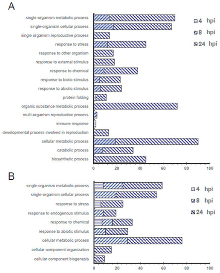 Biological process function analysis for tomato leaf proteins with a (A) significant increase or (B) decrease in quantity at different infection time points, 4, 8 or 24 hpi compared to the mock group. Only proteins with fold change greater than 1.5 or less than 0.67 (p < 0.05) were analysed and used for searching the Arabidopsis homolog proteins by Protein Basic Local Alignment Search Tool (BLASTP) against the Arabidopsis Information Resource (TAIR) database. Gene Ontology (GO) categorization of these Arabidopsis homolog proteins was performed by using the Database for Annotation, Visualization and Integrated Discovery (DAVID) v6.8.