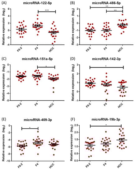 Association between circulating miRNA levels and severity of hepatic fibrosis and HCC in CHC. (A) miRNA-122-5p, (C) miRNA-151a-5p, and (D) miRNA-142-3p show a decreased expression in HCC, compared to cirrhosis, whereas (B) miRNA-486-5p shows an increased expression in HCC, compared to cirrhosis. (E) miRNA-409-3p shows an increased expression in F4, when compared to mild disease. (F) miRNA-19b-3p shows an increased expression in HCC compared to mild disease. Lines represent mean expression levels (±SEM). * p < 0.05, ** p < 0.01, *** p < 0.001. (Abbreviations: CHC = chronic Hepatitis C; F0-2 = mild disease; F4 = cirrhosis; HCC = hepatocellular carcinoma; miRNA = microRNA; SEM = standard error of the mean).