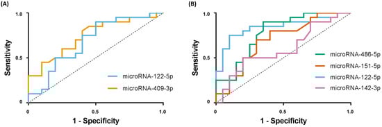 ROC curves for individual serum miRNAs to identify cirrhosis or HCC in chronic hepatitis C (A). ROC curve performance of miRNA-122-5p with AUC of 0.69 (95% CI 0.51–0.86, p = 0.023) and miRNA-409-3p with AUC of 0.74 (95% CI 0.58–0.90, p = 0.004) to identify cirrhosis when compared to mild disease. (B) ROC curve performance of selected miRNAs to identify HCC when compared to cirrhosis as follows: miRNA-486-5p, AUC of 0.78 (95% CI 0.63–0.93, p < 0.001); miRNA-151a-5p, AUC of 0.70 (95% CI 0.54–0.87, p = 0.014); miRNA-122-5p, AUC of 0.85 (95% CI 0.72–0.97, p < 0.001); miRNA-142-3p, AUC of 0.60 (95% CI 0.42–0.78, p = 0.140). (Abbreviations: AUC = area under the curve; HCC = hepatocellular carcinoma; miRNA = microRNA; ROC = receiver operating characteristic; 95% CI = 95% confidence interval).