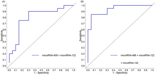 We used stepwise logistic regression, using forward selection and backward elimination, to develop serum miRNA panels that could distinguish cirrhosis or HCC (from mild disease and cirrhosis, respectively). A panel comprising miRNA-122-5p and miRNA-409-3p demonstrated optimal differential diagnostic performance for cirrhosis (vs. F0-2) with an AUC of 0.80 (95% CI 0.66–0.95, p < 0.001), sensitivity of 85%, specificity of 70%, negative predictive value (NPV) of 82%, positive predictive value (PPV) of 74%, and overall accuracy of 78% (Figure 3A). For HCC (vs. F4), an optimal panel comprising miRNA-122-5p, miRNA-486-5p, and miRNA-142-3p demonstrated excellent diagnostic performance with an AUC of 0.94 (95% CI 0.87–1.00, p < 0.001), sensitivity of 80%, specificity of 95%, NPV of 94%, PPV of 83%, and overall accuracy of 88% (Figure 3B).