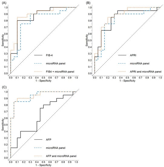 2.5. Comparative Performance of the Aspartate Aminotransferase-to-Platelet Ratio (APRI) and Fibrosis 4 (FIB-4) ± Serum miRNA Panel to Discriminate Cirrhosis
