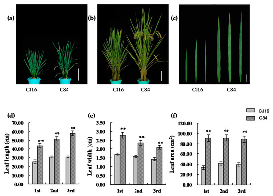 The leaf shape of parents of recombinant inbred lines (RILs). (a) Plant morphology at tillering stage; bar = 18 cm. (b) Plant morphology at heading stage; bar = 18 cm. (c) The top three leaves’ shape of CJ16 and C84. From left to right are the first leaf, the second leaf, and the third leaf, respectively; bar = 5 cm. (d) Comparison of the top three leaves’ length between CJ16 and C84. (e) Comparison of the top three leaves’ width between CJ16 and C84. (f) Comparison of the top three leaves’ area between CJ16 and C84. Data are represented as mean ± SD (n = 11). Asterisks represent significant difference determined by Student’s t-test at p-value <0.01 (**), p-value <0.05 (*).