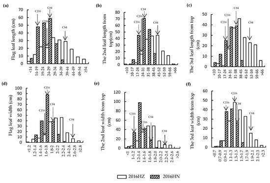 Frequency distributions of leaf traits in CJ16/C84 RILs. (a) Flag leaf length; (b) the second leaf length from top; (c) the third leaf length from top; (d) flag leaf width; (e) the second leaf width from top; (f) the third leaf width from top. HZ: Hangzhou; HN: Hainan.