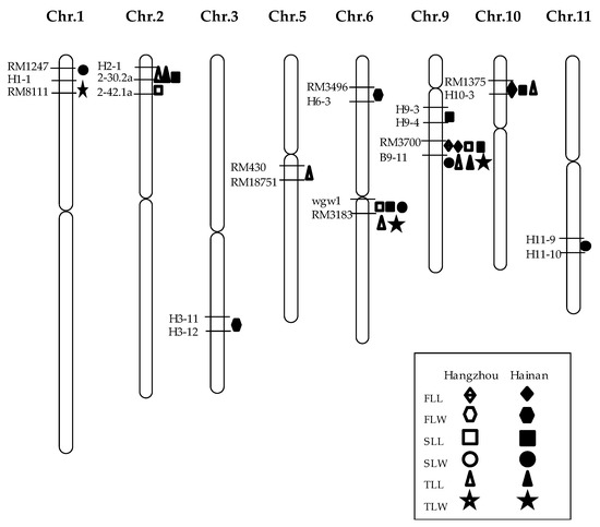 The correlation analysis for leaf traits in the RIL population showed a low correlation between Hangzhou and Hainan for the length of the second and the third leaf. However, the flag leaf length and width, and the second and third leaf width, were significantly positively correlated between the two environments. This could be the result of the indica–japonica subspecies differentiation of the parents and the distinct temperature and light conditions of Hangzhou and Hainan (Table 1).