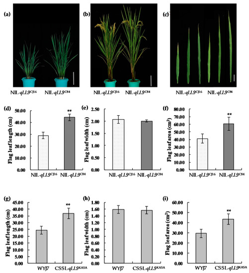 Phenotypes of near-isogenic lines and chromosome segment substitution lines. (a) Plant morphology at tillering stage; bar = 18 cm. (b) Plant morphology at heading stage; bar = 18 cm. (c) The top three leaf shape of NIL-qLL9CJ16 and NIL-qLL9C84. From left to right are the first leaf, the second leaf, and the third leaf, respectively; bar = 5 cm. Comparison between the NIL-qLL9CJ16 and NIL-qLL9C84 for the flag leaf length (d), the flag leaf width (e), and the flag leaf area (f). Comparison between Wuyunjing (WYJ) 7 and chromosome segment substitution line (CSSL)-qLL9KASA for the flag leaf length (g), the flag leaf width (h), and the flag leaf area (i). Data are mean ± SD (n = 15). Asterisks represent significant difference determined by Student’s t-test at p-value < 0.01 (**).