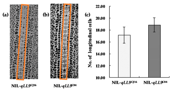 Histological cell morphology of NIL-qLL9CJ16 and NIL-qLL9C84. (a,b) Comparison of cytological morphological characteristics in the orange boxes between the two genotypes of the NIL set; bar = 200 μm. (c) Number of longitudinal cells in NIL-qLL9CJ16 and NIL-qLL9C84. Data are mean ± SD (n = 15) and no significant difference was found.