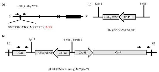 CRISPR/Cas9 vector construction. (a) Primer sequence on LOC_Os09g26999. (b) The intermediate vector SK-gRNA contains the U3 promotor and sgRNA scaffold. (c) Binary vector pC1300-Cas9 contains the 2 × 35S promotor and a Cas9 protein. SK-gRNA-Os09g26999 are digested with Kpn I and Bgl II, respectively, and cloned into pC1300-Cas9 (digested with Kpn I and BamH I) by a one-step ligation.