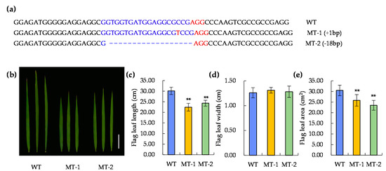 It has been reported that DEP1 is mainly related to panicle development [63]. To further verify its correlation with leaf development, the CRISPR/Cas9 gene knockout technique was adopted in the genetic background of Nipponbare (Figure 7). Two knockout plants of LOC_Os09g26999, namely mutant 1 (MT-1) and mutant 2 (MT-2), were screened in T0 generation (Figure 8; Figure S2). After continuous selfing and marker assay, homozygous positive transgenic lines in T2 generation were obtained and used for investigating the flag leaf morphology. The results showed no significant difference in the flag leaf width between the knockout and wild-type plants. However, the flag leaf length and area were significantly decreased in both knockout lines. (Figure 8b–e). The results showed that qLL9 was mainly responsible for the leaf length development, and the loss-function of qLL9 could lead to a reduction in leaf length, and thereby leaf area.