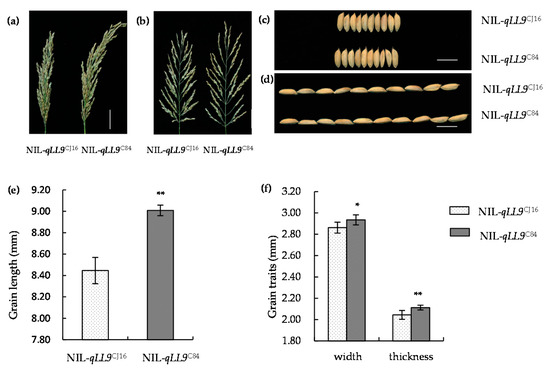 Panicle and grain morphology of NIL-qLL9CJ16 and NIL-qLL9C84. (a,b) Panicle morphology at heading stage; bars = 4 cm. (c,d) Grain morphology at repining stage; bar = 1 cm. (e) Grain length. (f) Grain width and thickness. Data are represented as mean ± SD (n = 10). Asterisks represent significant difference determined by Student’s t-test at p-value <0.01 (**), p-value <0.05 (*).