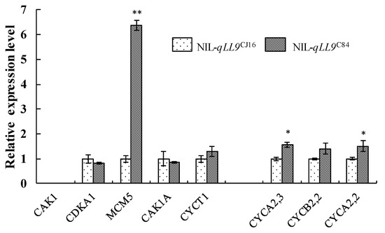 Comparison of eight cell cycle related gene expression between NIL-qLL9CJ16 and NIL-qLL9C84 at the heading stage by qRT-PCR, and the data are represented as mean ± SD (n = 3); asterisks represent significant difference determined by Student’s t-test at p-value <0.01(**), p-value <0.05 (*).