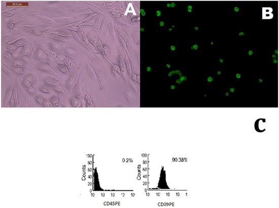 (A) An inverted microscope micrograph on day 14 from primary culture of mesenchymal stem cells showing many spindle-shaped stem cells, ×200. (B) Fluorescent microscopic image of tissue culture demonstrating the green fluorescence of MSCs labeled with GFP two weeks after implantation (fluorescent technique, ×200). (C) Flow cytometric analysis of surface antigens of MSCs, MSCs were positive for CD29 and negative for CD45.