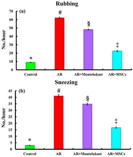 To investigate the role of MSCs in AR, we used an AR rat model and administered OVA with aluminum hydroxide gel for 15 days. We measured the number of sneezing and nose rubbing motions in one hour after challenging the rats with OVA via nasal inhalation. The results showed that the rats in the AR model group sneezed (41.00 ± 1.13 No./h) and rubbed (61.00 ± 1.11 No./h) their noses significantly) p < 0.05), more frequently than those in the control group (3.00 ± 0.16 and 8.95 ± 0.31 No./h, respectively). Interestingly, the sneezing and nasal rubbing numbers were significantly (p < 0.05) lower in the rats treated with multiple dosages of MCSs (16.63 ± 0.60 and 22.48 ± 0.84 No./h; respectively) from the commencement of OVA administration (Figure 2a,b) compared to AR model and (AR + Montelukast) groups. Simultaneously, we observed that the sneezing and rubbing numbers of the AR + Montelukast rats (34.87 ± 0.74 and 48.06 ± 0.58 No./h; respectively) showed a similar change after treatments with Montelukast and MSCs strategies. Notably, treatment with MSCs inhibits sneezing and rubbing frequencies more significantly than montelukast) p < 0.05). This result suggests that MSCs have a therapeutic effect on acute AR rats.