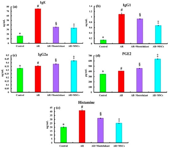 Since immunoglobulins play important roles in mediating inflammatory reactions and hypersensitivity, we investigated the concentration of several main immunoglobulin antibodies that have been implicated in B-cell immune responses controlled by cytokines from TH cells. IgE, IgG1, IgG2a, PGE2, and histamine levels were determined. There was significant (p < 0.05) elevation in a TH2-dependent immune response indicated by an increase in the serum levels of OVA-specific IgE, IgG1, IgG2a, PGE2 and histamine in the AR group when compared with the control group (Figure 3). These findings are in accordance with several previous studies [33,34], which revealed that re-exposure to the same antigen triggers degranulation of mast cells via IgE-mediated mechanism and finally leads to an increased release of inflammatory mediators in nasal mucosa, manifested by sneezing, itching, and watery discharge [33,35]. Interestingly, treatment with MSCs had a statistically significant (p < 0.05) tendency to reduce the secretion of IgE, IgG1, and histamine, indicating that MSCs may downregulate TH2 immune responses. In contrast, IgG2a and PGE2 levels were significantly (p < 0.05) higher in the AR+MSC group than the AR group. This reveals the TH1 immune response may be priming by the mounting of IgG2a and PGE2 production [8,36]. In other words, the maintenance of IgG1 and increase of IgG2a suggest the shift of TH2 to TH1 immune response. This shift may be responsible for the reduction of allergic inflammation by MSCs injection.